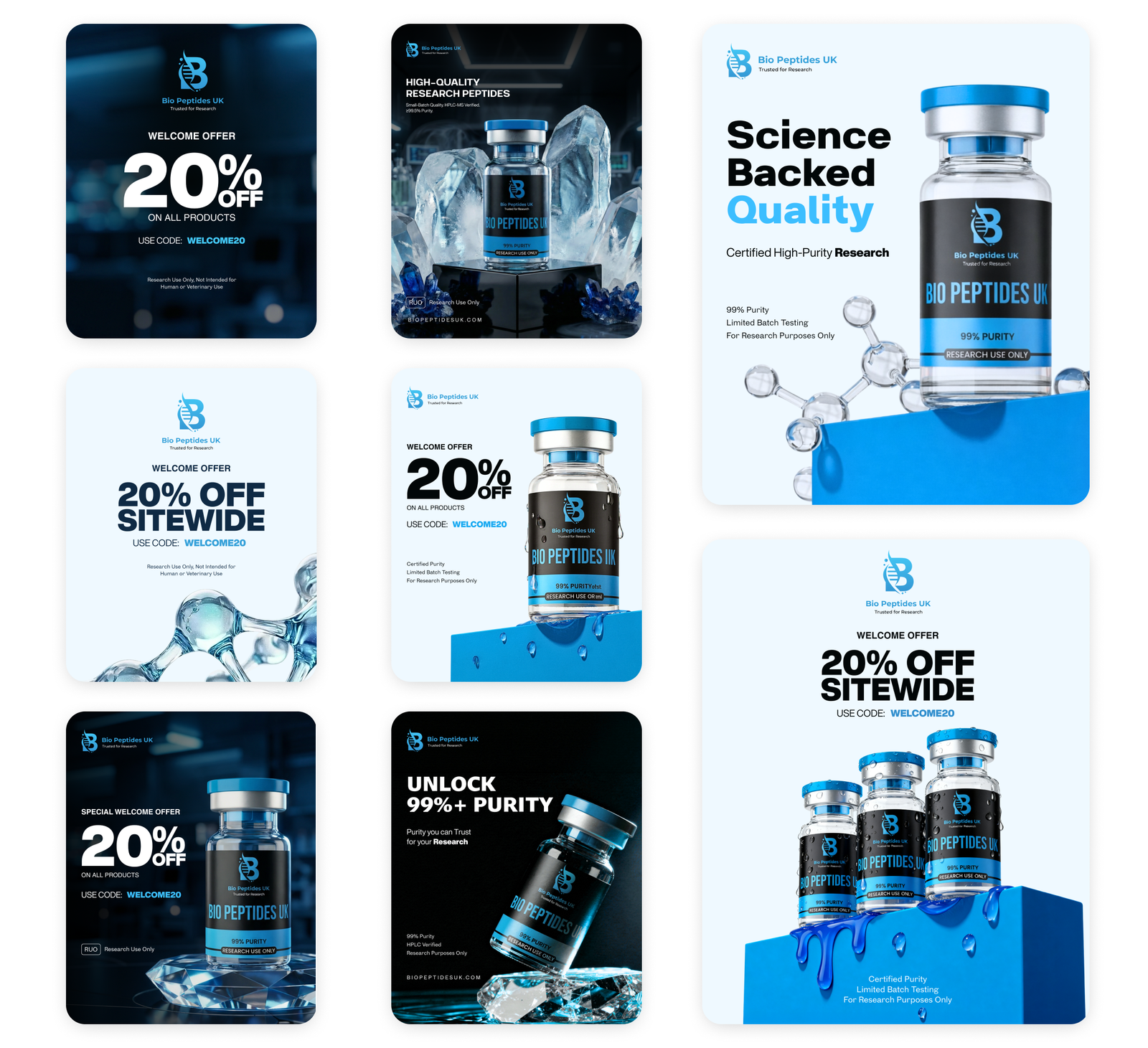 We redesigned product visuals and social media creatives to match a clean laboratory-focused identity. Since Bio Peptides UK supplies peptides strictly for research purposes, we ensured all marketing followed compliance standards and avoided risky claims. This helped reduce ad disapprovals and improved audience trust.